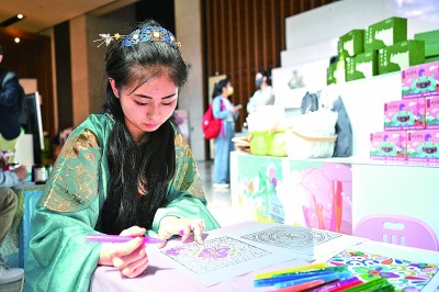 中國(guó)國(guó)家博物館內(nèi),觀眾在紙上進(jìn)行文物紋樣涂鴉。新華社發(fā)