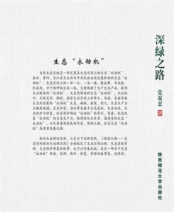 面向未來(lái)理論創(chuàng)新,立定當(dāng)下治理實(shí)踐。《深綠之路——生態(tài)空間理論與治理實(shí)踐》全面敘述了生態(tài)空間治理、生態(tài)系統(tǒng)管理、生態(tài)保護(hù)修復(fù)的故事。也可以形象地說(shuō),這是一部關(guān)于生態(tài)“永動(dòng)機(jī)”構(gòu)造、原理、保護(hù)、修復(fù)、管理的故事集、說(shuō)明書。