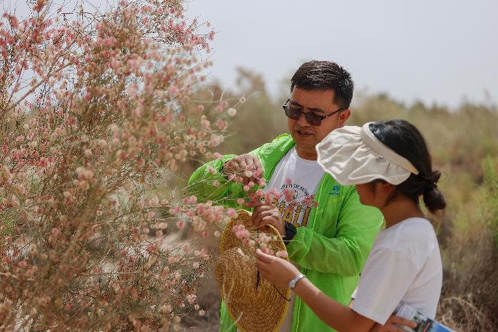 2023年6月12日,在中科院新疆生態(tài)與地理研究所策勒沙漠研究站天然試驗(yàn)區(qū),買爾當(dāng)和學(xué)生查看沙拐棗生長(zhǎng)情況。新華社記者 郝昭 攝