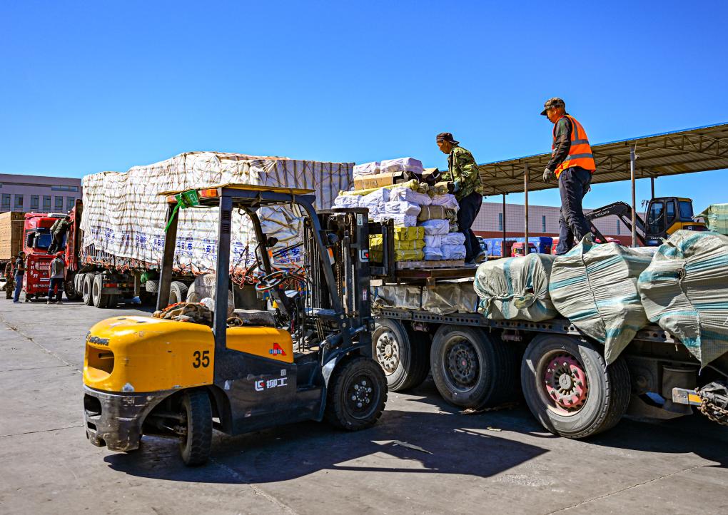 2023年6月11日,工人在二連浩特口岸旁的進出口物流園區(qū)中裝載準(zhǔn)備出口的貨物。新華社記者 彭源 攝