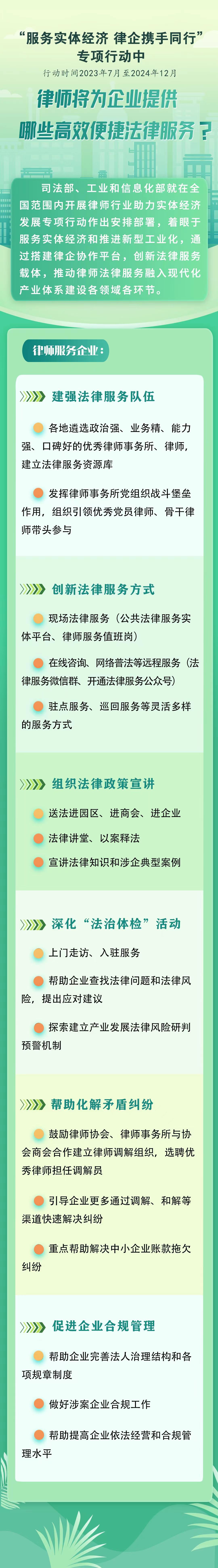 方案要求,各地司法行政部門、工業(yè)和信息化主管部門、通信管理局和律師協(xié)會要共同組織優(yōu)秀律師事務(wù)所和律師,為工業(yè)和信息化領(lǐng)域相關(guān)企業(yè)提供全業(yè)務(wù)、全時空、高效便捷的法律服務(wù)?;顒又校甯黝惼髽I(yè)法律服務(wù)需求,建強(qiáng)法律服務(wù)隊(duì)伍,創(chuàng)新法律服務(wù)方式,通過開展法律政策宣講、深化“法治體檢”活動等形式,推動律師行業(yè)服務(wù)實(shí)體經(jīng)濟(jì)的廣度和深度不斷拓展,服務(wù)的專業(yè)性、精準(zhǔn)性、便捷性、實(shí)效性不斷增強(qiáng),幫助企業(yè)化解法律風(fēng)險(xiǎn),解決法律問題,維護(hù)合法權(quán)益,提升依法合規(guī)經(jīng)營管理水平。