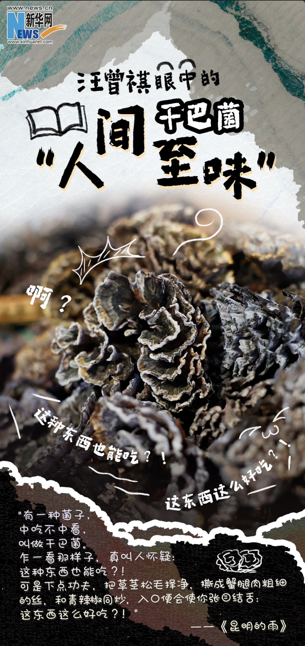 在《七載云煙·采薇》的打油詩(shī)中,他寫(xiě)到“人間至味干巴菌,世上饞人大學(xué)生。”果然,越是獨(dú)特的東西,越招人喜歡。在《昆明食菌》一文中,汪老說(shuō),干巴菌是“菌子里味道最深刻”的,它無(wú)疑給了汪老一個(gè)大大的驚喜!