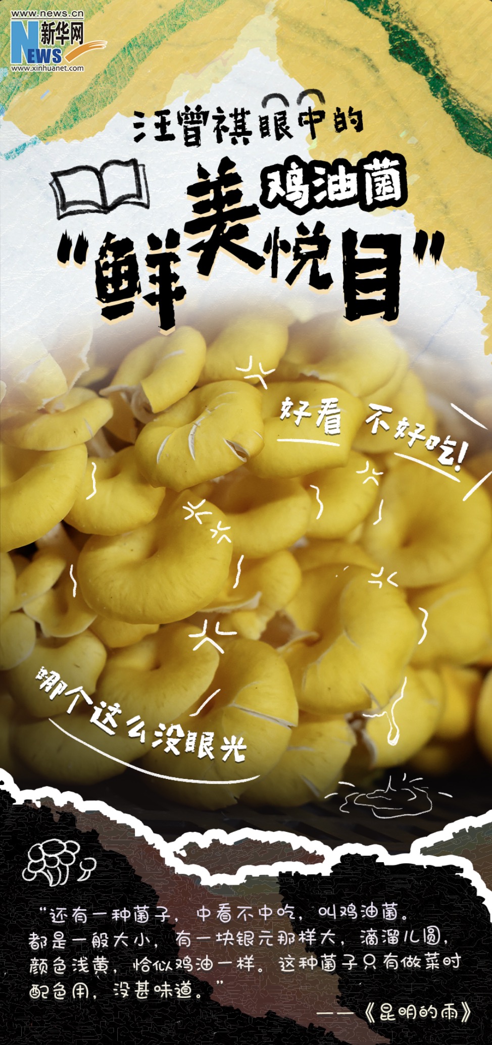 色彩是食物的殺手锏,暖黃色常常激起人們的食欲。雞油菌天然的色彩,很難讓人不聯(lián)想到云南的明媚陽(yáng)光。汪曾祺的美食散文中常常蘊(yùn)含著美食文化的哲思,他用雞油菌作為菜品的配色,也頗有些食物特有色彩美學(xué)的雅趣。