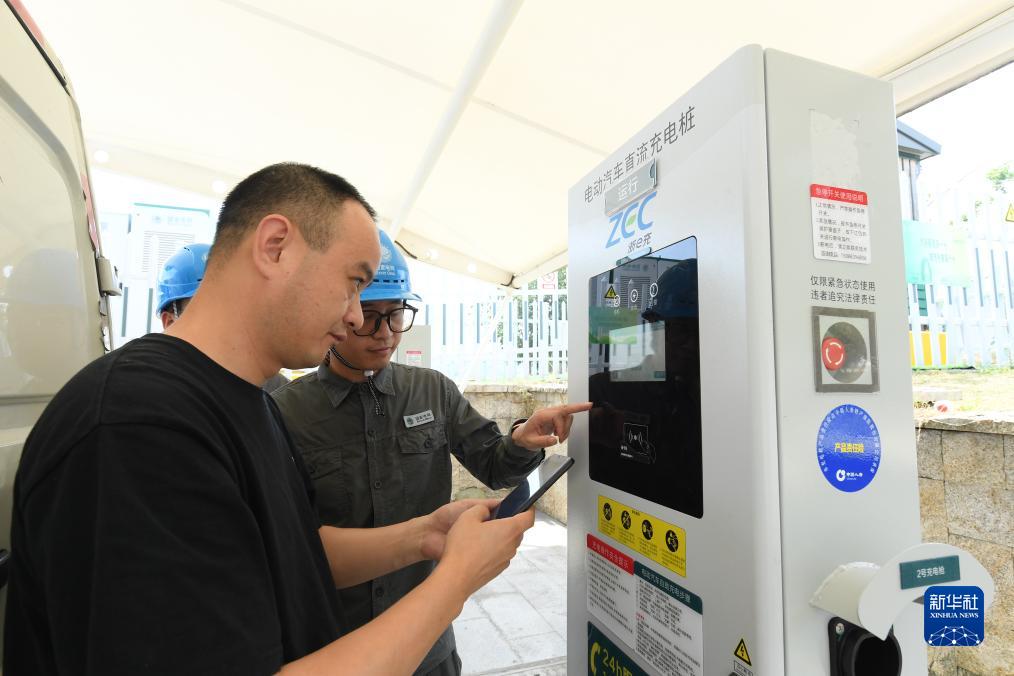 8月11日,游客在安吉余村一處停車場為電動車充電。