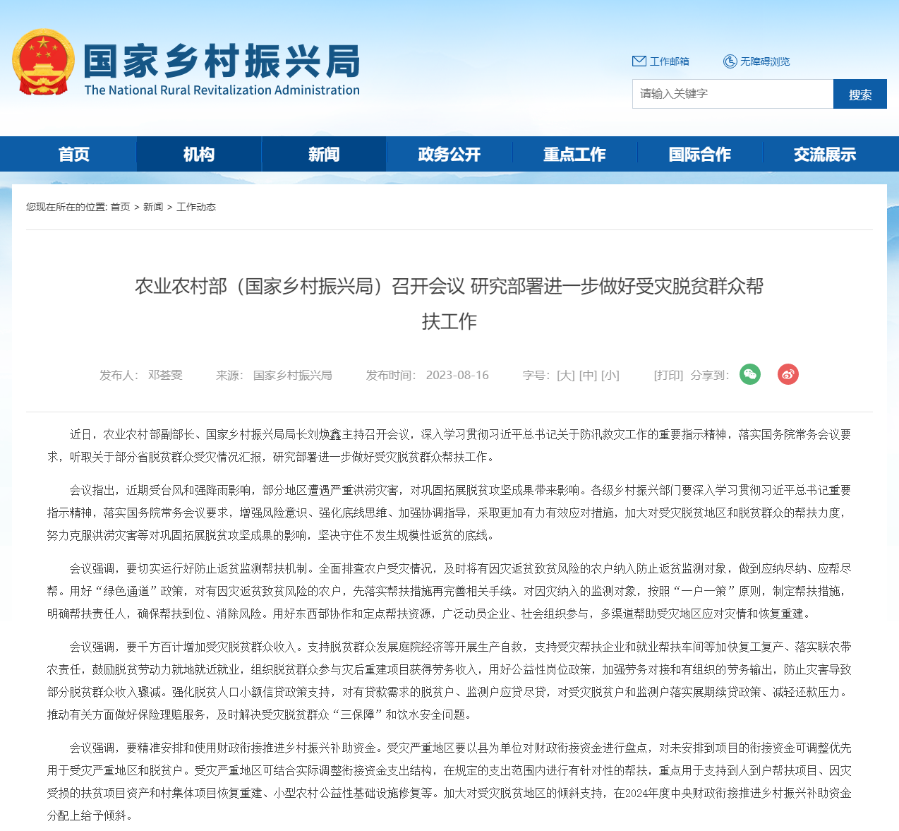 會(huì)議要求切實(shí)運(yùn)行好防止返貧監(jiān)測(cè)幫扶機(jī)制。全面排查農(nóng)戶受災(zāi)情況,及時(shí)將有因?yàn)?zāi)返貧致貧風(fēng)險(xiǎn)的農(nóng)戶納入防止返貧監(jiān)測(cè)對(duì)象。用好“綠色通道”政策,對(duì)有因?yàn)?zāi)返貧致貧風(fēng)險(xiǎn)的農(nóng)戶,先落實(shí)幫扶措施再完善相關(guān)手續(xù)。用好東西部協(xié)作和定點(diǎn)幫扶資源,多渠道幫助受災(zāi)地區(qū)應(yīng)對(duì)災(zāi)情和恢復(fù)重建。