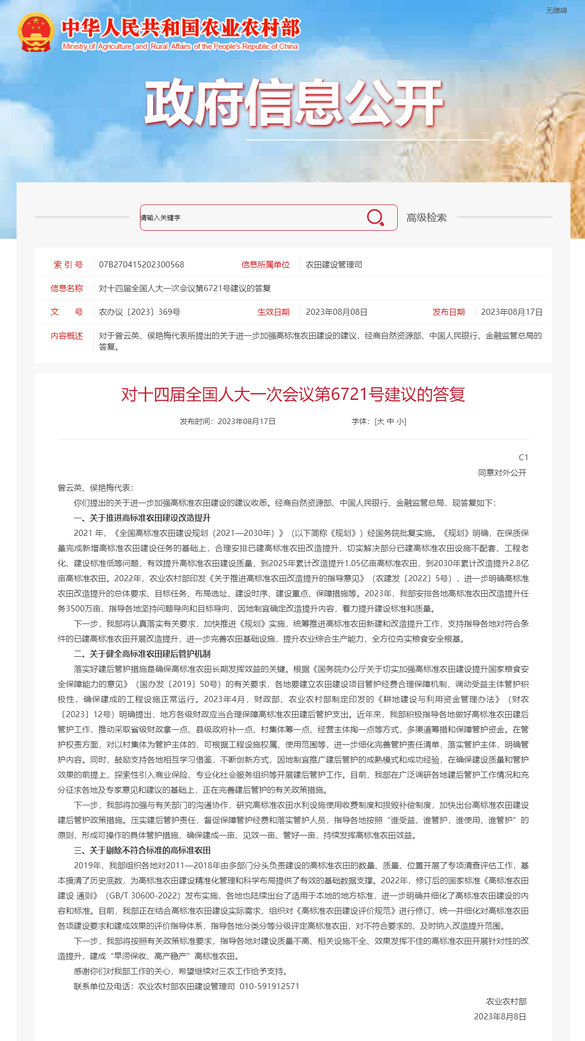 央視網(wǎng)消息:8月17日,農(nóng)業(yè)農(nóng)村部公布對十四屆全國人大一次會議第6721號建議的答復(fù)。其中提出,下一步,農(nóng)業(yè)農(nóng)村部將加強(qiáng)與有關(guān)部門的溝通協(xié)作,研究高標(biāo)準(zhǔn)農(nóng)田水利設(shè)施使用收費制度和損毀補(bǔ)償制度,加快出臺高標(biāo)準(zhǔn)農(nóng)田建設(shè)建后管護(hù)政策措施。壓實建后管護(hù)責(zé)任,督促保障管護(hù)經(jīng)費和落實管護(hù)人員,指導(dǎo)各地按照“誰受益、誰管護(hù),誰使用、誰管護(hù)”的原則,形成可操作的具體管護(hù)措施,確保建成一畝、見效一畝、管好一畝,持續(xù)發(fā)揮高標(biāo)準(zhǔn)農(nóng)田效益。