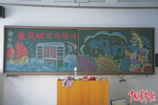8月21日,北京市房山區(qū)石樓中學(xué)、夏村中學(xué)的師生一起畫(huà)出迎接開(kāi)學(xué)的黑板報(bào)。張藝/攝