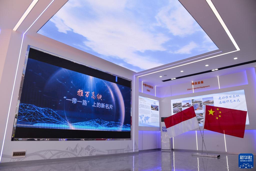這是7月20日在印度尼西亞萬隆德卡魯爾車站旁拍攝的中國中鐵印尼雅萬項(xiàng)目經(jīng)理部展廳內(nèi)景。新華社記者 徐欽 攝