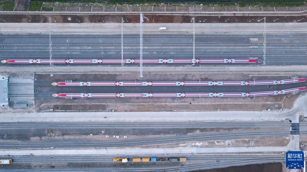 7月20日,雅萬高鐵列車停靠在印度尼西亞萬隆德卡魯爾動(dòng)車所附近(無人機(jī)照片)。新華社記者 徐欽 攝
