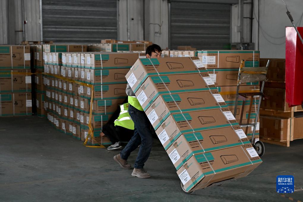 11月4日,在阿拉山口綜合保稅區(qū)內(nèi)的跨境電子商務(wù)分揀清關(guān)中心,工作人員將國產(chǎn)空調(diào)裝車準備運往國外。新華社記者 李鑫 攝
