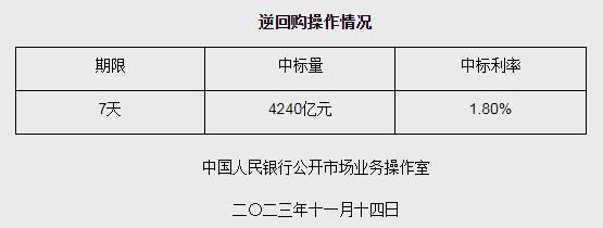 據(jù)央行網(wǎng)站消息,為維護(hù)銀行體系流動(dòng)性合理充裕,2023年11月14日人民銀行以利率招標(biāo)方式開展了4240億元逆回購操作,中標(biāo)利率1.80%,期限為7天。具體情況如下: