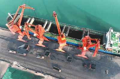 連日來,江蘇連云港港加快冬季電煤運輸和儲備,全力保障發(fā)電企業(yè)供暖用煤需求。圖為11月22日,貨輪在連云港港煤炭碼頭卸載電煤。王春攝(人民視覺)