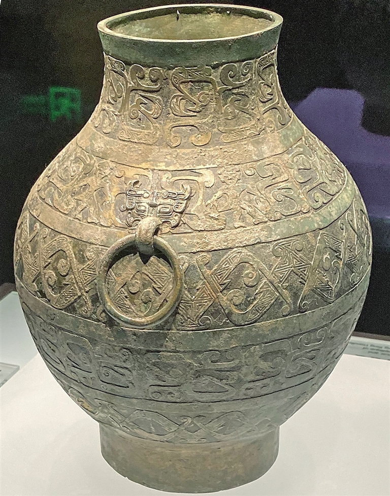 舞人與獸紋鋪首銜環(huán)耳青銅壺。(受訪者供圖)