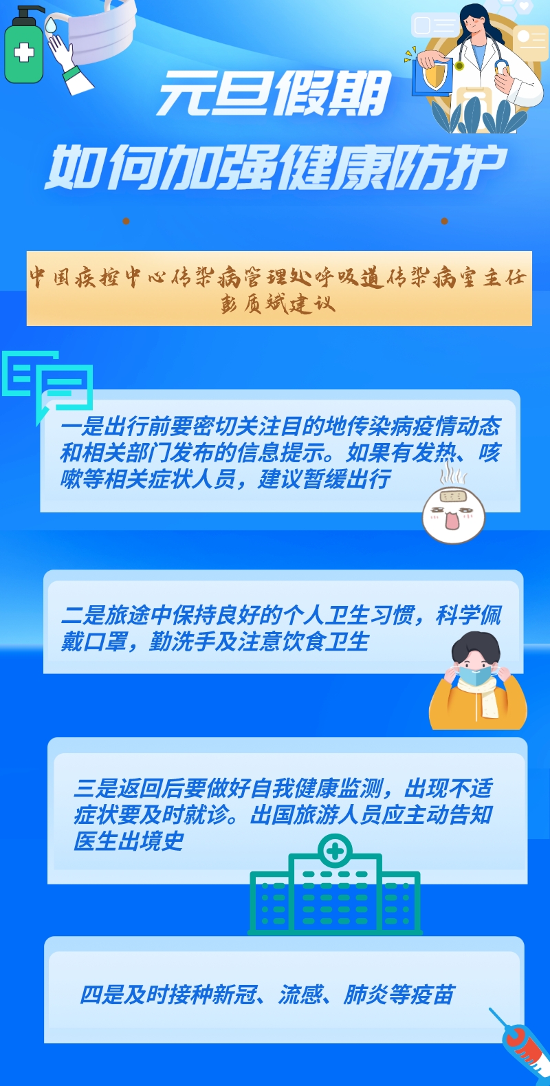 元旦假期中,人員流動(dòng)增多,探親訪友、旅游出行、聚會(huì)聚餐等增加,呼吸道疾病傳播風(fēng)險(xiǎn)加大,做好健康防護(hù)至關(guān)重要。