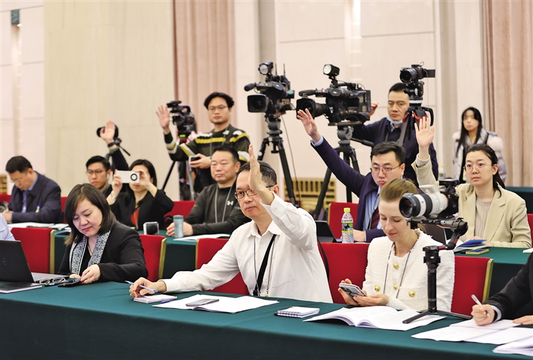 三月六日,中外媒體記者走進北京人民大會堂,參加十四屆全國人大二次會議陜西代表團媒體開放日活動。圖為記者舉手爭取提問機會。 記者 母家亮攝